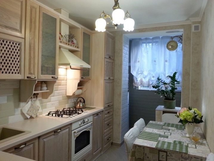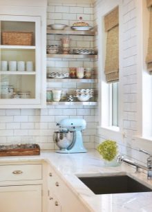 Можете да изберете полуматови плочки, които се чувстват като естествен камък. Лек комплект с къдрави дръжки, цветя в керамични вази, декор с елементи от Прованс – такава кухня ще отговаря на всеки вкус.