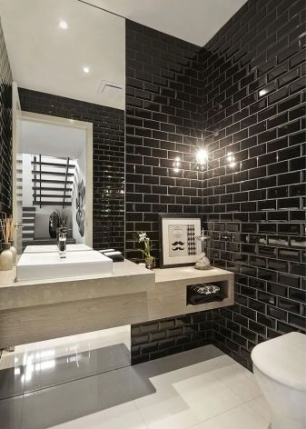 Тоалетна и баня – още два типа помещения, в които можете да поставите “свинята”. Тук ще работи всякакъв вид плочки.. Това могат да бъдат матови тухли в няколко нюанса, традиционната снежнобяла версия, полупрозрачни пастелни нюанси и т.н. Баня или тоалетна изглежда доста необичайно, стените на които са облицовани с лъскави черни плочки. В този случай шевовете трябва да бъдат бели..