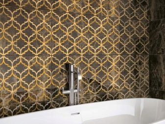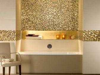 Такава плочка може да бъде както голяма, така и малка под формата на мозайка. Тези покрития напълно имитират златото, запазвайки жълтеникавия си оттенък и изискания блясък. Такова покритие изглежда доста скъпо, тъй като има елегантна позлатена повърхност.. По правило се купува само за акцентна декорация..