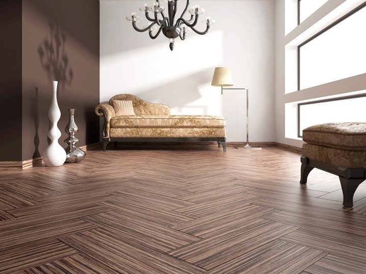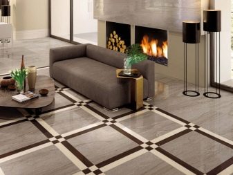 Подовите плочки могат дори да се използват за декориране на подовете на класически хол. За да направите това, изберете модели за паркет и направете полагането с френска рибена кост. В същото време тесните елементи от плочки се поставят плътно един към друг, без да се фугира. Така се създава ефектът на монолитен дървен под..
