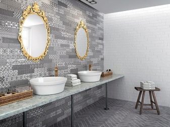 Този дизайн на плочки е един от най -ярките и стилни. Обикновено стените в кухнята в зоната на престилката, стените в банята и в коридора са завършени по този начин, но не е обичайно да се фурнират напълно всички повърхности в този стил, тъй като това покритие е твърде ярко и пъстро.