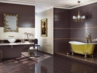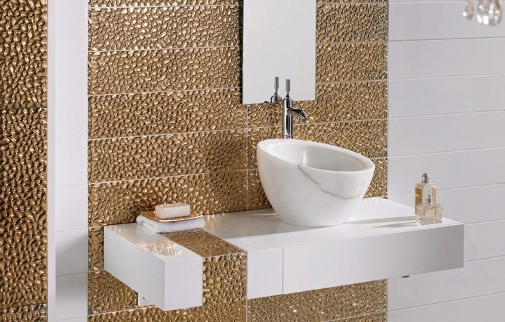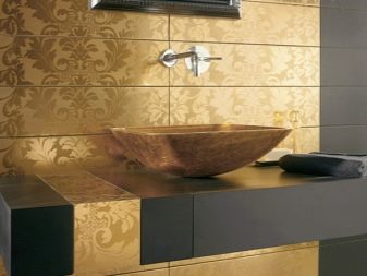 Такава плочка може да бъде както голяма, така и малка под формата на мозайка. Тези покрития напълно имитират златото, запазвайки жълтеникавия си оттенък и изискания блясък. Такова покритие изглежда доста скъпо, тъй като има елегантна позлатена повърхност.. По правило се купува само за акцентна декорация..
