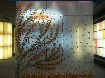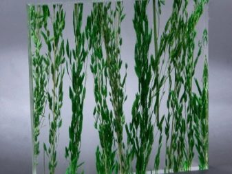 Тези модели са много стилни, но необичайни. Разликата между тези дизайнерски елементи на плочките е, че те са напълно прозрачни продукти, под стъклото на които има истински цветя, листа, клони, камъни, уши и други естествени елементи. С тяхна помощ можете да изложите цели композиции или да ги използвате за акцентна декорация.. По -добре е да използвате такива вложки, за да разнообразите повърхността на стените в комбинация с фоновото покритие на плочките..