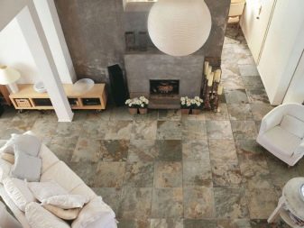 Особено популярни са винтидж каменни плочки с изкуствено състарена повърхност и текстура. По правило дизайнът на такива продукти се характеризира с неравни ръбове, износвания и стружки. Това покритие изглежда много интересно и елегантно..