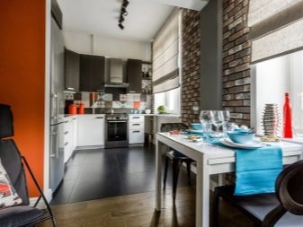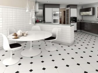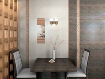 Подовите настилки от плочки могат да се използват за зониране в студио апартамент. Той върви добре с много други довършителни материали. Те могат да поставят пода и стените в зоната на кухненската престилка, а в зоната за хранене и всекидневна, да покрият подовете с ламинат. Освен това дизайнът на плочката може да повтори ламинираното покритие..