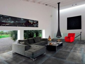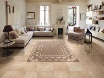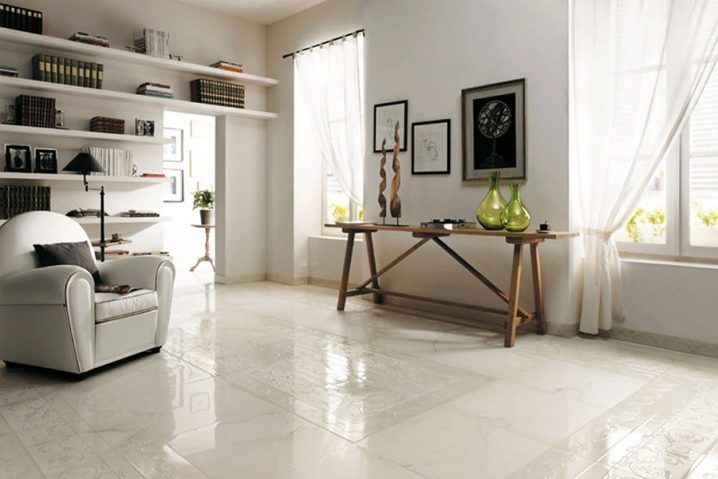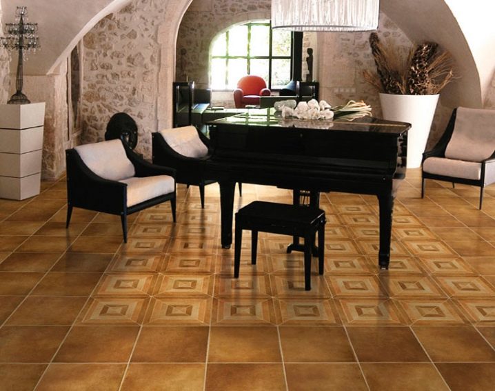 Подовите плочки могат дори да се използват за декориране на подовете на класически хол. За да направите това, изберете модели за паркет и направете полагането с френска рибена кост. В същото време тесните елементи от плочки се поставят плътно един към друг, без да се фугира. Така се създава ефектът на монолитен дървен под..
