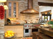 Каменните покрития са перфектно комбинирани с дървени мебелни елементи, с ковани фитинги и метал.