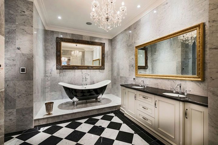 Златната плочка изглежда перфектно в банята близо до огледалото под формата на рамка, както и в зоната на кухненската престилка. Можете да комбинирате хромирани и златни повърхности, за да създадете най -интересните шарки и да играете.