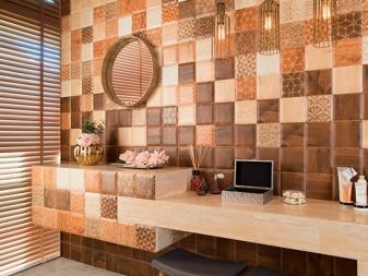 Този дизайн на плочки е един от най -ярките и стилни. Обикновено стените в кухнята в зоната на престилката, стените в банята и в коридора са завършени по този начин, но не е обичайно да се фурнират напълно всички повърхности в този стил, тъй като това покритие е твърде ярко и пъстро.