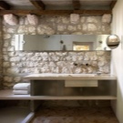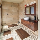 За семейни стаи и още повече за технически – за деца, спални и помещения за обслужване на къщата, си струва да изберете по -евтини материали, например керамични плочки. Сред тях можете също да вземете модел, имитиращ естествен камък. В резултат на това истински каменни плочки и изкуствени плочки могат да се комбинират перфектно в една стая..
