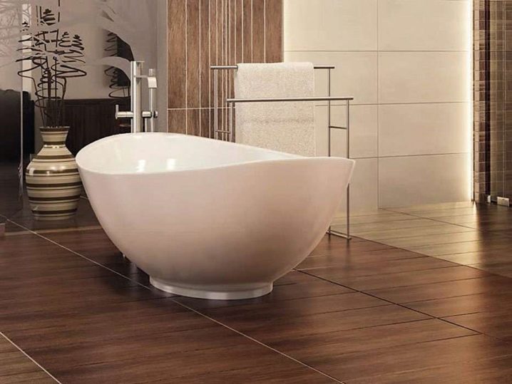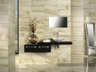Порцелановият камък е идеален за полагане на пода в банята. Отличава се с матово покритие и се предлага в различни цветове и текстури. Продуктите с грапава или оребрена повърхност изглеждат особено красиви. Такава плочка ви позволява да създадете не твърде хлъзгаво покритие, но ще струва няколко пъти повече от обикновено..