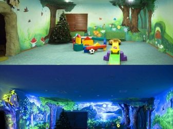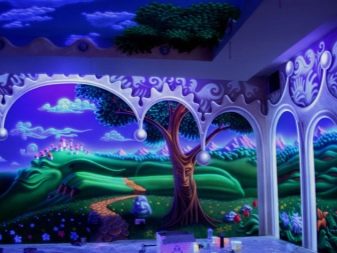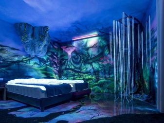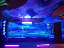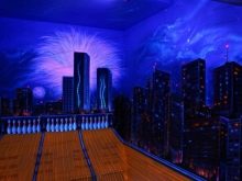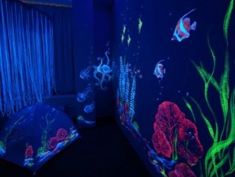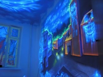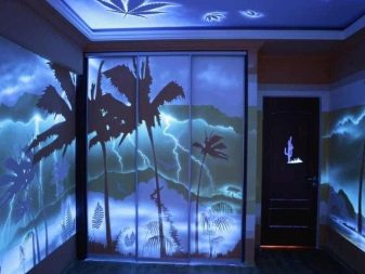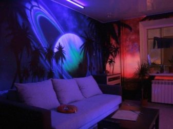 В детска стая неоновият тапет може да бъде триизмерен панел със светлоотразителни елементи или платно през тавана, изобразяващо звездно небе. В коридора таванът е украсен с флуоресцентни тапети.
