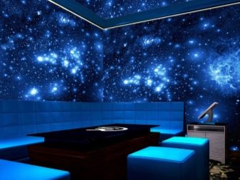 За декорация на тавана най -популярни са 3D тапети под формата на звездното небе, космоса и планетите. Флуоресцентните тапети за детските стаи трябва да бъдат избрани, като се вземат предвид вкусовете на детето: космически кораби, герои от приказки или научнофантастични филми.