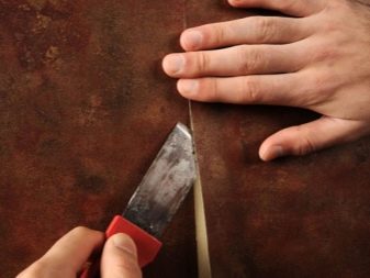 Когато използвате този метод, трябва да се има предвид, че хартиеният тапет нараства по размер след нанасяне на лепило и се свива след изсъхване. Запомнянето на това свойство е необходимо, така че многократното свързване на шаблона след прореза да е най -точно, а лепящите се части да се припокриват една с друга с минимално припокриване. Можете да използвате метода само ако на тапета има картина. На обикновени платна няма да е възможно да се гарантира, че разрезът остава невидим..