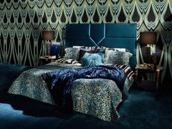- Дизайнът на спалнята в стил арт деко с декоративен фон в малки цветя е израз на комфорт и лукс, леглото с мека табла изглежда подчертано модерно, лаконична лампа допълва ултрамодния дизайн. Кожено одеяло в такава спалня изглежда уютно и стилно..