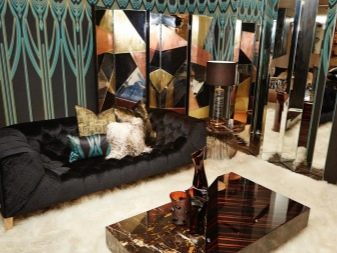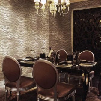 Фантазии на тема крокодилска кожа – подходящ елемент за стила арт деко, маси от хромиран метал и стъкло, екстравагантни лампи от изобилие от кристални топки ще създадат луксозен ефект.