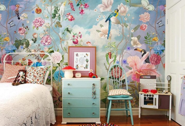 Ярките пролетни тонове, познати на флоралните теми, ще бъдат най -подходящият вариант за декориране на детска стая. Цветните щампи в стаята на малко дете помагат за създаването на спокойна среда.