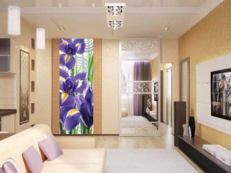 Оригинално решение би било да украсите отделна стена с цветя, което ще помогне за организиране на ясно зониране в стаята. Например, използвайки букети и пъпки, можете да създадете „панел“ над място за работа или място за спане.