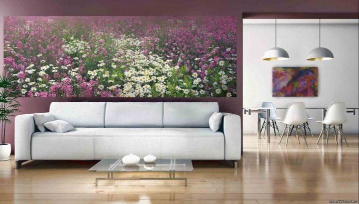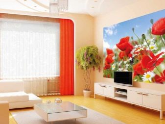 Тапетите с цветя изглеждат страхотно в хола. Покритията с ярко оранжеви и жълти съцветия изглеждат много стилни; те придават уникален уют и топли нотки на стаята. Можете да постигнете отличен ефект, като вземете платна в най -ярките нюанси, които ще украсят както стените в хола, така и в целия апартамент..