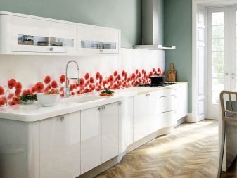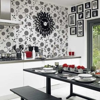 - Използването на мотиви с цветя в стила на минимализма е много характерно. Малък лен или тънка ивица цветя в зоната за хранене изглежда доста интересно.