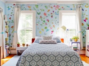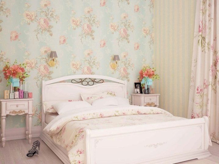 Има много начини да използвате цветни покрития в спалня. Най-често срещаният вариант е да украсите интериора с флорални орнаменти в пастелни цветове. Леките тапети с малки букети цветя, които са почти невидими на основния фон, ще направят спалнята по -деликатна и ще гарантират приятна и уютна атмосфера в нея.