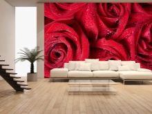 Тапетите с червени рози ще изглеждат добре в хола или спалнята. Благодарение на очарователните червени цветове, можете да създадете прекрасна романтична атмосфера в спалнята. Ярък акцент от една голяма разцъфнала пъпка или няколко цветя, събрани в композиция, ще украси перфектно една от стените на хола.