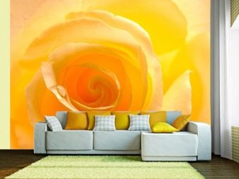 Тапетът с жълта роза може да ви развесели, така че всекидневната или детската стая ще бъдат отличен вариант за дадено цвете или композиция от тях. Оранжевите пъпки са идеални за стаи със северни прозорци. Тапети с такъв модел ще изглеждат и в кухнята, защото оранжевият цвят има не само затоплящ ефект, но и повишава апетита.