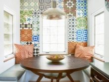 - Инкрустациите от шарено покритие играят не само роля в оптичната промяна на пространството. Понякога те добавят лукс и представяне в стаята. Моделът върху акцентното парче може да се припокрива с текстилния модел в настройката;