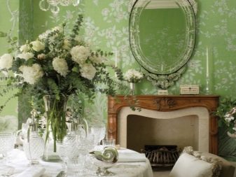 - шарки под формата на цветя и растения винаги ще бъдат добра комбинация със зелени обикновени тапети;
