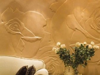 Използвайки ролкови материали, можете да създавате необичайни ефекти. Платната изглеждат най -добре в интериора., предназначени да имитират венецианска мазилка. Те могат да имат метален, меден или бронзов блясък. Златната декорация на стени изглежда скъпа и красива.
