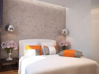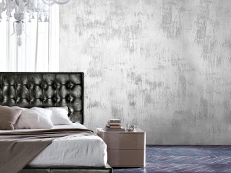 - В спалнята тапетът “под мазилка” с пълна липса на шарки и рисунки ще изглежда красив и хармоничен. Можете да допълвате такъв интериор с помощта на стенни лампи или картини в рамка..