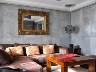 Ако този вид декорация е предназначена за хол, тогава трябва да преобладават спокойни тонове. И за да подчертаете всяка област, можете да използвате стенни лампи или картини със стара рамка..