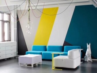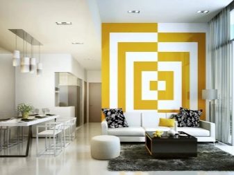 Геометричните форми и линии се считат за най -добрия вариант при декориране на хол, защото геометрията е много мощен инструмент, който ви позволява да зададете правилния ритъм за една стая. Както малка абстрактна рисунка, така и модерна 3D картина могат да действат като материален модел..