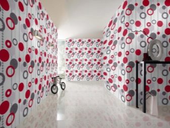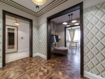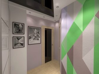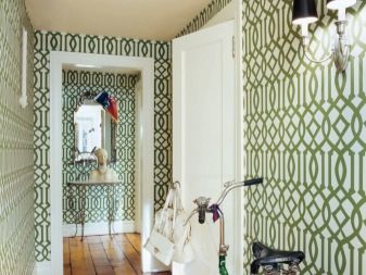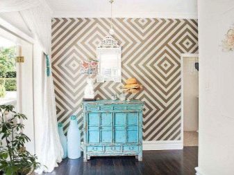 Тапетите с прецизни математически форми са много популярни при проектирането на проходни зони като коридори и коридори. В такива интериори дърпащите ефекти на довършителните работи няма да попречат, тъй като стаите не се различават по големи размери. За коридори, които са лишени от естествена светлина, геометричните шарки на светъл фон ще бъдат от значение. Те ще направят стаята по -светла и по -интересна..