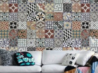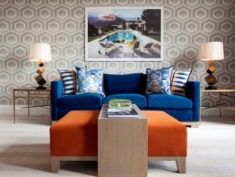 Геометричните орнаменти в големи размери помагат да се създадат акценти в декора на стаята. Любима техника на дизайнерите е да подчертаят основната зона в хола с покритие с такъв модел. Трябва да се има предвид, че големите елементи допринасят за визуалното сближаване на стените и намаляват пространството.. Не се увличайте прекалено с такива платна и залепете с тях цялата стая..