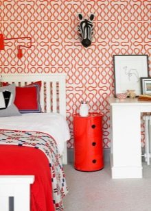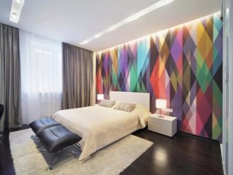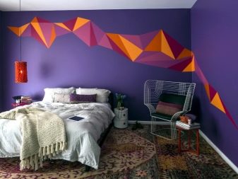 - Геометричните стенни покрития с голям модел винаги привличат вниманието; на техния фон завесите и други текстилни изделия трябва да бъдат едноцветни и без допълнително орнаментиране. Същото правило важи и за мебелите: колкото по -голям и по -ярък е десенът, толкова по -спокойна е повърхността на мебелите..