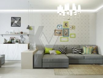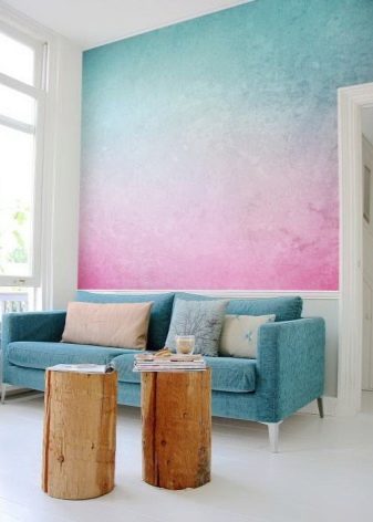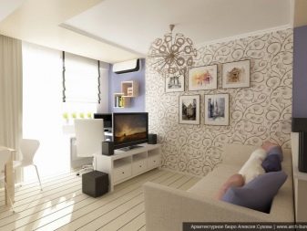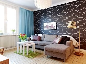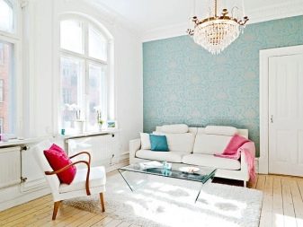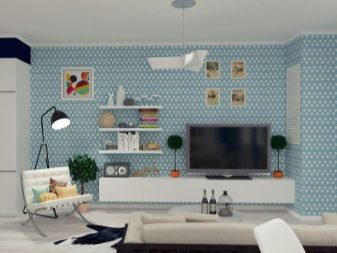 - за малките стаи най -доброто решение е да поставите на тапет стена, която играе ролята на фон за диван, рафтове или телевизор.