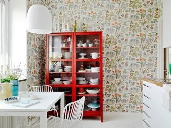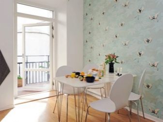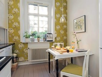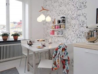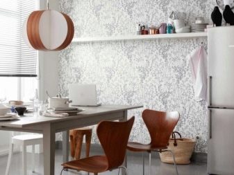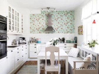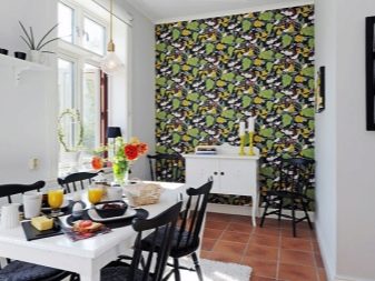 - За да украсите кухнята, разумно е да използвате тапети, върху които е уловена флората и фауната на Скандинавия. Алтернативни опции са материали с флорален или геометричен дизайн..