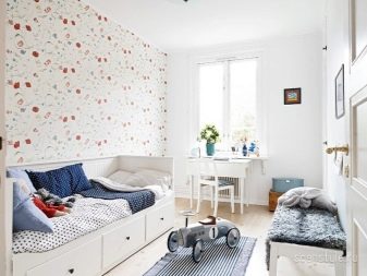 Декорирането с тапети в скандинавски стил е актуално и за други помещения. Тъй като са леки, такива материали ще бъдат отлично допълнение към интериора на кабинета, без да разсейват вниманието и в същото време да ви подготвят за ползотворна дейност. Стенните покрития, направени в пастелни цветове и допълнени с приказни илюстрации, са идеални за детска стая като декорация за зоната за игра и сън. Веселите платна няма да се намесват в коридора., особено тази, която няма естествена светлина.