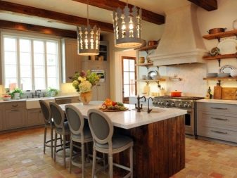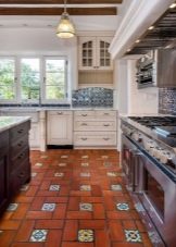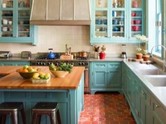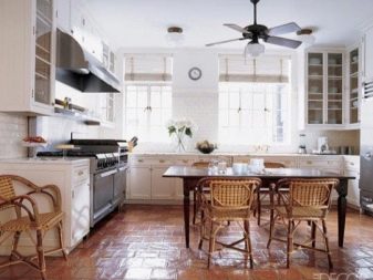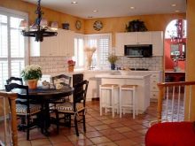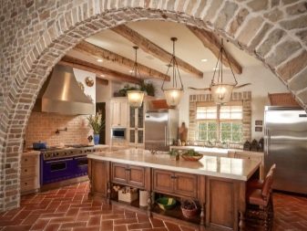 - Средиземноморската тема, допълнена от селска, продължава във вътрешността на кухнята. За пореден път подовите плочки са хармонично комбинирани с тухлената зидария и дървените греди на тавана. Стаята изглежда особено естествена, издръжлива. Използването на по -светли плочки е логично в съвременните кухни.