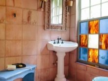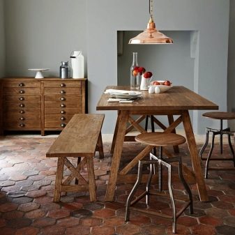 - С доминирането на плочките като довършителни материали, мебелите и други интериорни детайли се препоръчват да бъдат взети в естествени нюанси, прости геометрични форми, без блясък.