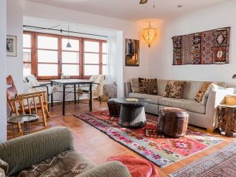 - Комбинацията от теракота и ярки нюанси на синьо, оранжево и зелено позволява да се постигне оригиналност на тази стилна трапезария-хол. Именно теракотата е основата тук и ви позволява да избегнете бунт от цветове..