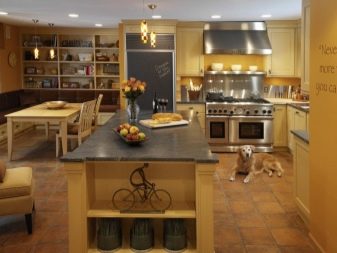 - Плочките от теракота в кухнята изглеждат много органично. С лице към пода и стените в кухненския гръб са най -универсалните опции. В стилизирани селски кухни, където има например печка, стената близо до нея също може да бъде облицована с плочки. Използването на ярко жълти, наситено сини или сиви цветове също ще помогне да се избегне монохромно и да направи кухнята по -светла..