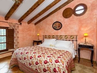 - Селският стил на спалнята в таванското помещение идва от използването на матови плочки на пода. Теракотната мазилка по стените и дървените таванни греди и рамки също спомогнаха за предаването на естествеността и оригиналността на интериора. Текстилът с печатна шарка донесе нотки на романтизъм и лекота.