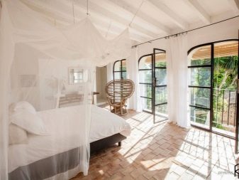 - Различен стилистичен ефект беше постигнат в спалнята в средиземноморски стил. Комбинацията от теракотни плочки като подови настилки и мебели от ратан, както и снежнобяли завеси и балдахин е олицетворение на свобода, романтизъм, морска свежест. Изобилието от естествена светлина и високите тавани са предпоставка за такъв интериор. Между другото, “зеленина” може да бъде внесена директно в стаята под формата на саксии с палмови дървета или вертикално озеленяване на една от зоните.