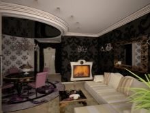 Тъмните тапети хармонично ще подчертаят зоната за релакс в просторната всекидневна в класически стил. Стенните картини в рамка, като декорация, няма да пречат на общата атмосфера, но ще й придадат уважение.