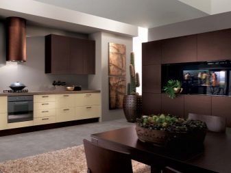 - Тъмните тапети в кухнята са добри за разделяне на пространството на функционални зони. Тъмният цвят може да се използва за обозначаване на трапезария или работна зона, в зависимост от местоположението на кухнята и трапезарията.