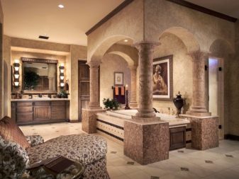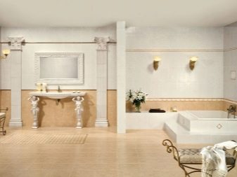 За антична вана можете да използвате камък в светло бежови тонове, различни комбинации от размери на плочки ще бъдат подходящи, например плочки от малки парчета, които са разпръснати с рамка или мозайка. В античния стил са подходящи подови панели, корнизи и дори декоративни колони..