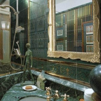 Когато използвате такива комбинации, можете да добавите нюанси на цветове на различни камъни (например мрамор), включително скъпоценни (смарагд, нефрит и т.н.), което ще добави лукс и необичайност към дизайна. Използването на допълващи се цветове е много важно, тъй като тяхното отсъствие може да направи банята да изглежда като обществено пространство или лекарски кабинет..