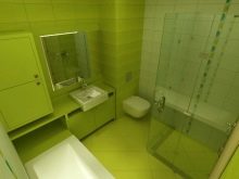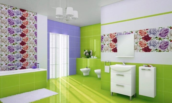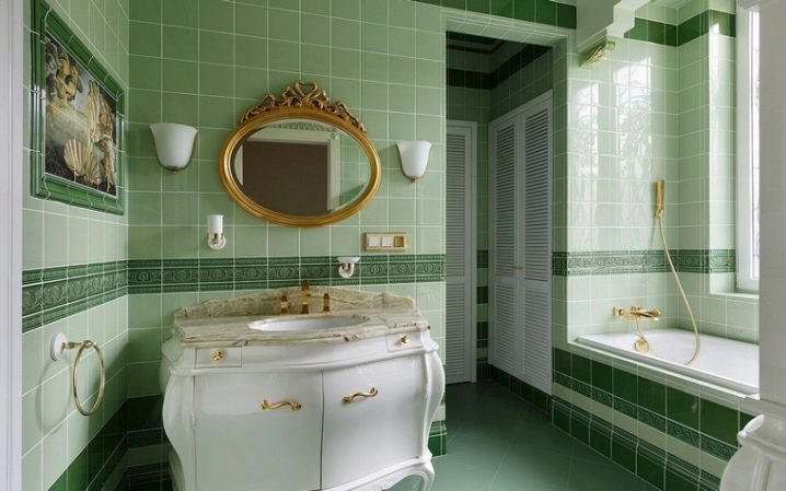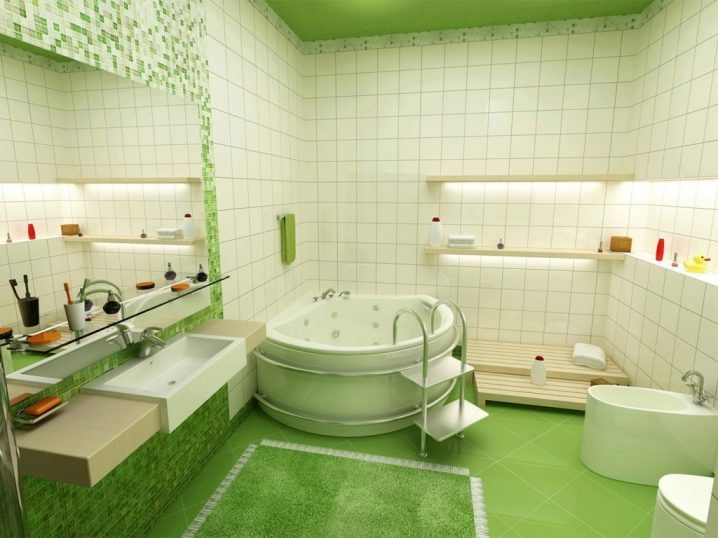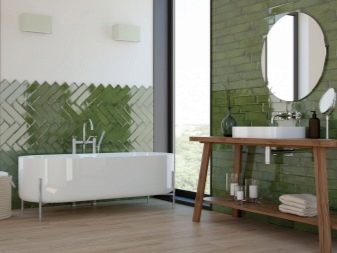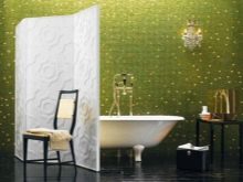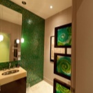 - с твърдо решение да се направи стаята изключително зелена, е наложително да се работи с палитрата, а също така ще бъде много оригинално да се използват плочки с различни повърхности, например, за да се съчетаят лъскавите плочки с мат и т.н., в противен случай стаята ще изглежда като скучна стая.